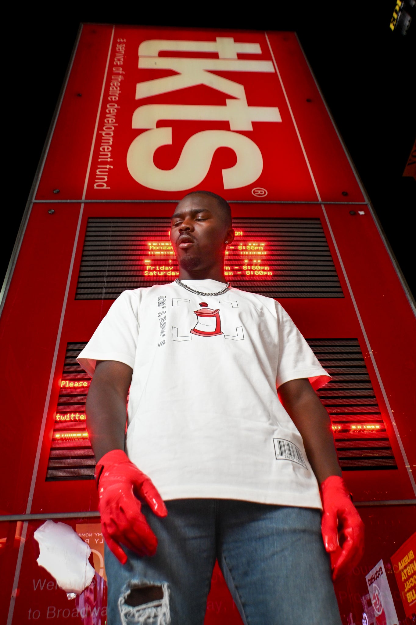 Locked in white tee. Heavyweight, Oversized, w/ targeting spraycan, and NYC coordinates