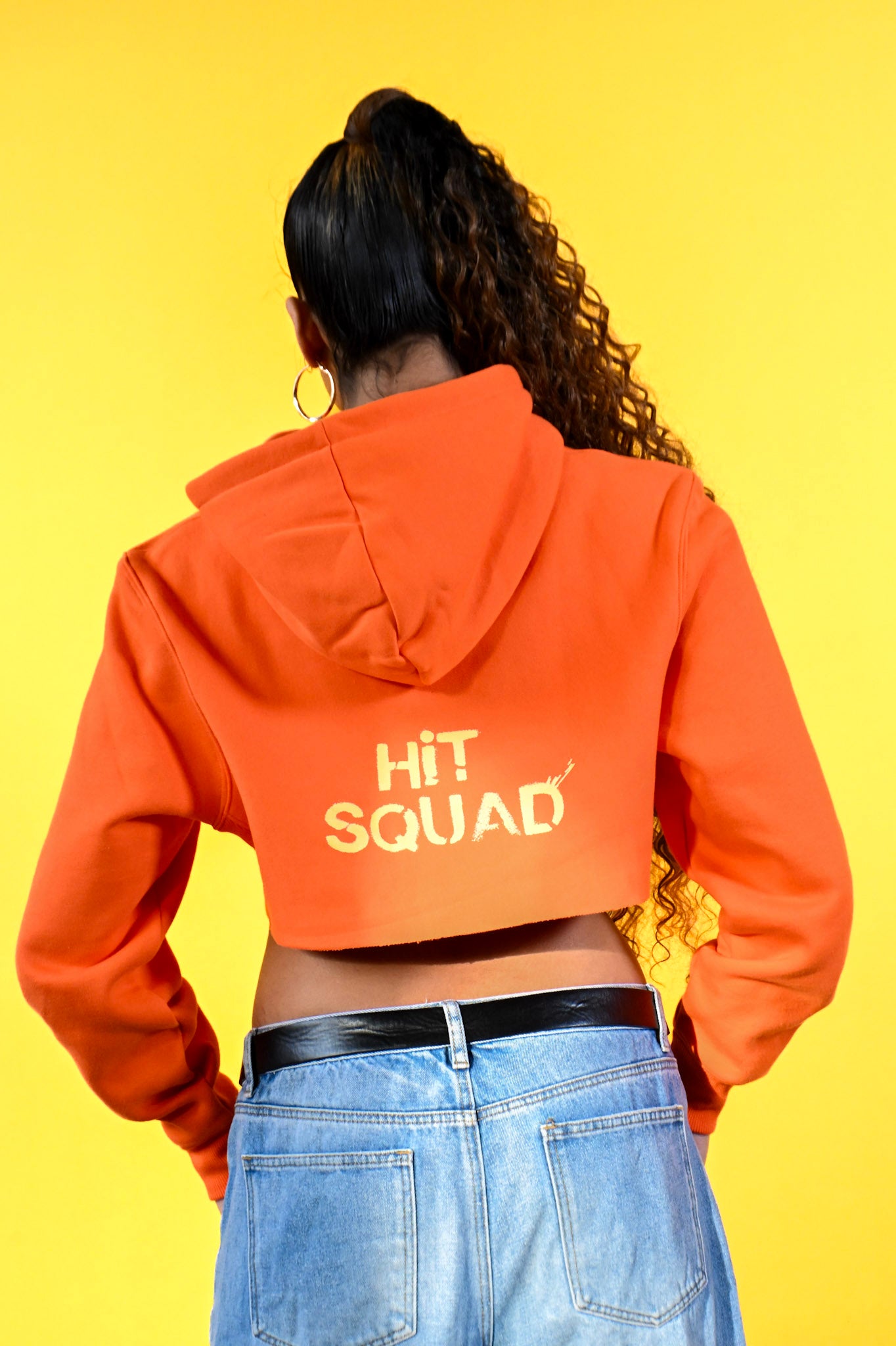 Heavyweight cropped orange hoodie with Hit Squad flaming graphics